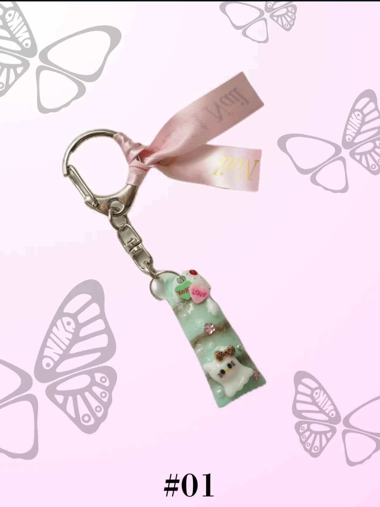 Featuring a soft mint green base, accented with pearls, stones, and a charming 3D motif, this design is full of appeal. The pink ribbon tag is adorned with the “ONIKA nail” logo, adding a touch of elegance when attached to a bag or pouch.